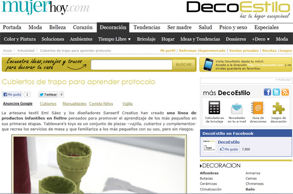 Extracto: Tableware’s toys se compone de diferentes colecciones de útiles orientados a la mesa, elaborados íntegramente en fieltro, lana y otros materiales textiles de origen natural, con lo que se configura un producto sostenible y cuyo proceso productivo tiene un bajo impacto ambiental. Más info Mujer de Hoy o Sanserif.es