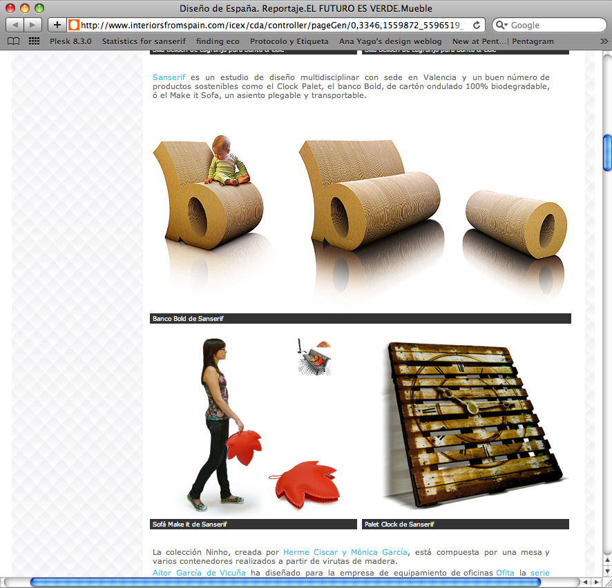 Extracto del texto: Sanserif es un estudio de diseño multidisciplinar con sede en Valencia y un buen número de productos sostenibles como el Clock Palet, el banco Bold, de cartón ondulado 100% biodegradable, ó el Make it Sofa, un asiento plegable y transportable.