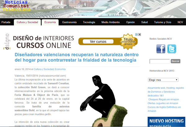 Extracto: (···) La última incorporación a la serie de asientos en cartón ondulado reciclado de Sanserif Creatius, la colección Bold Green, se dará a conocer internacionalmente en la próxima edición de la Feria Maison & Object de París, que se celebrará del 24 al 28 de enero, en la capital francesa. Se trata de una evolución de la conocida familia de asientos sostenibles Bold, en la que el césped tapiza las piezas para crear muebles-jardín. (···) Más info en Noticias Comunidad Valenciana