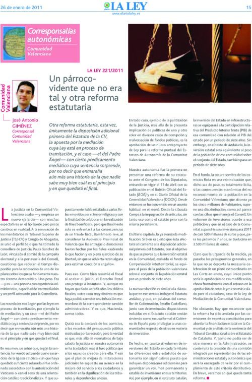 Extracto: Otra reforma estatutaria, esta vez, únicamente la disposición adicional primera del Estatuto de la CV, la apuesta por la mediación cuya Ley está en proceso de tramitación, y el caso —el del Padre Ángel— con cierto predicamento mediático cuya sentencia sorprende, por no decir que enmaraña aún más una historia de la que nadie sabe muy bien cuál es el principio y en que quedará el final.