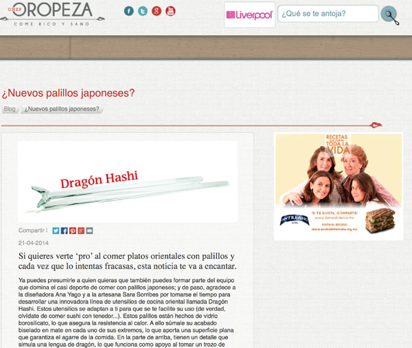 Extracto: (···) Ya puedes presumirle a quien quieras que también puedes formar parte del equipo que domina el casi deporte de comer con palillos japoneses; y de paso, agradece a la diseñadora Ana Yago y a la artesana Sara Sorribes por tomarse el tiempo para desarrollar una innovadora línea de utensilios de cocina oriental llamada Dragón Hashi (···) Más info en El blog del Chef Oropeza
