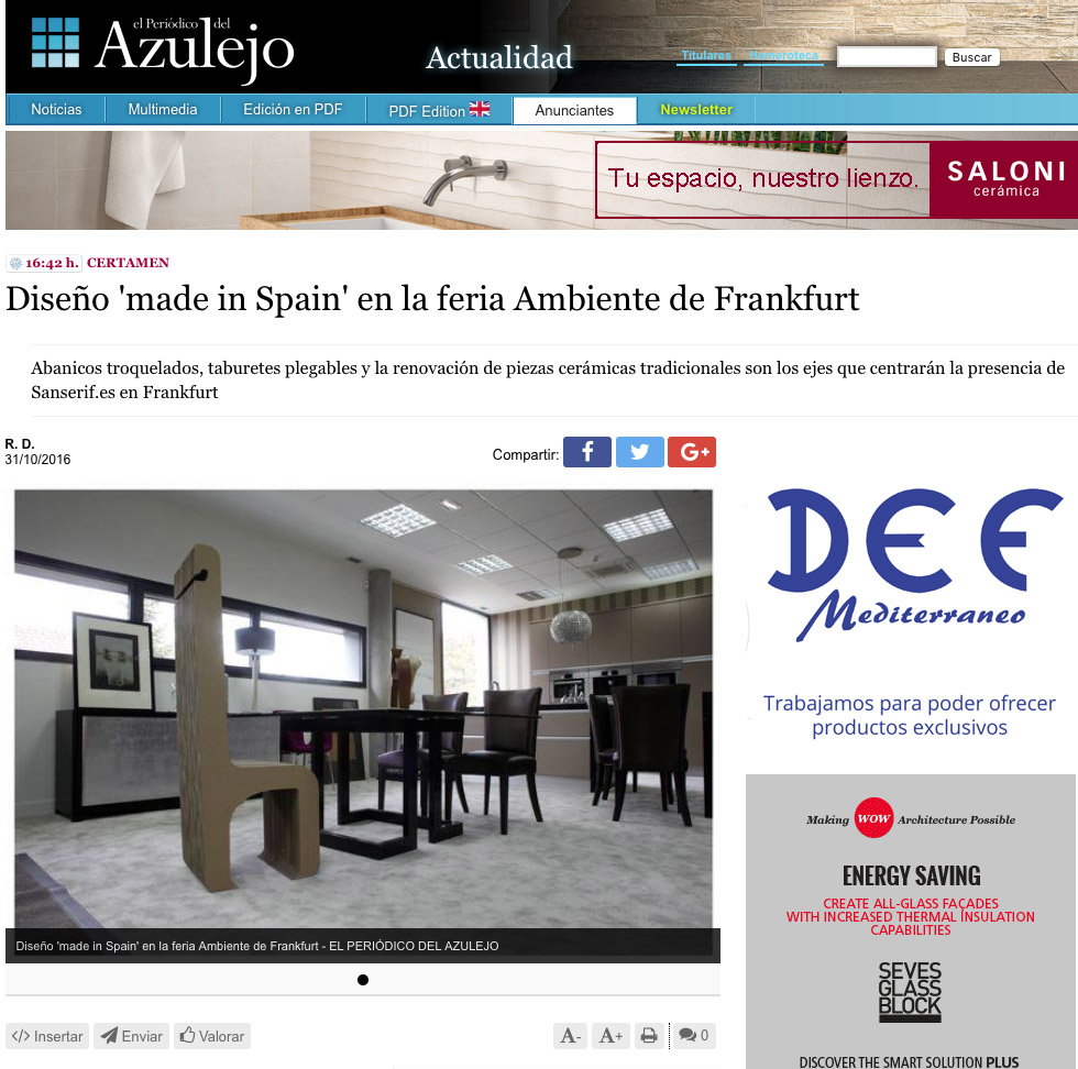 Extracto: “Los diseñadores valencianos Sanserif Creatius han sido seleccionados para el área de talentos (Talents) de la próxima edición de la Feria Ambiente Frankfurt (Alemania), un panel de promesas internacionales del diseño que se celebra anualmente en el principal encuentro internacional de bienes de consumo de Europa. Los abanicos artesanales troquelados con mensajes, piezas cerámicas clásicas reinventadas y los asientos plegables sostenibles serán algunas de las propuestas que compartirán espacio con las últimas tendencias en innovación y creatividad del mundo.” Más info en El Periódico del Azulejo