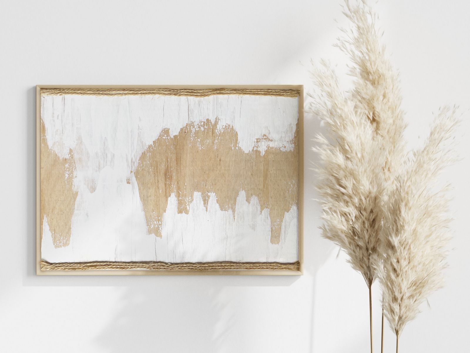 Cuadro de 52 x 40 cm. Acrílico, cáñamo y yute sobre madera terciada de abedul y bastidor de 35mm. Marco caja flotante de madera de ayous natural.