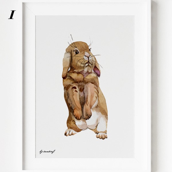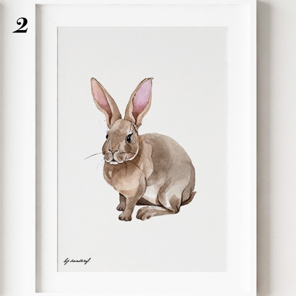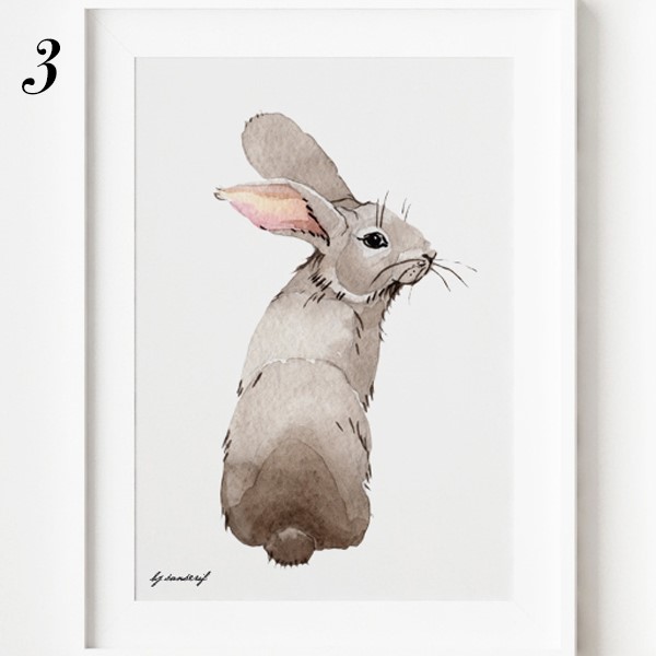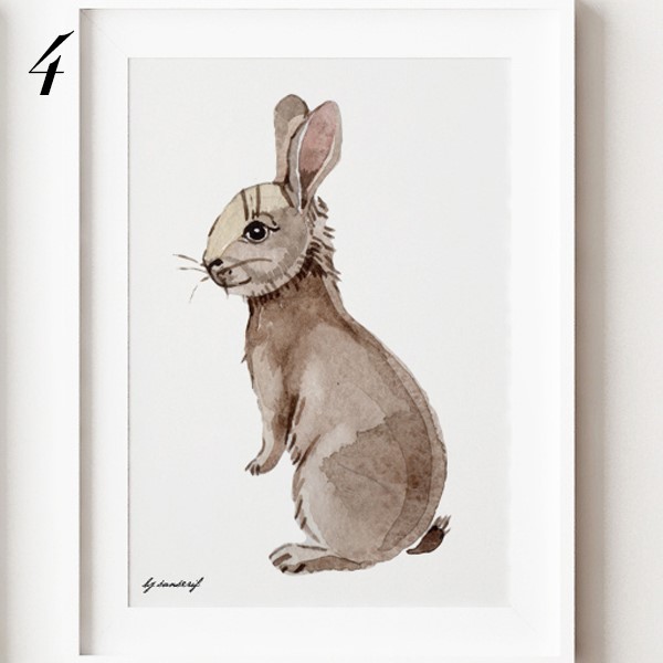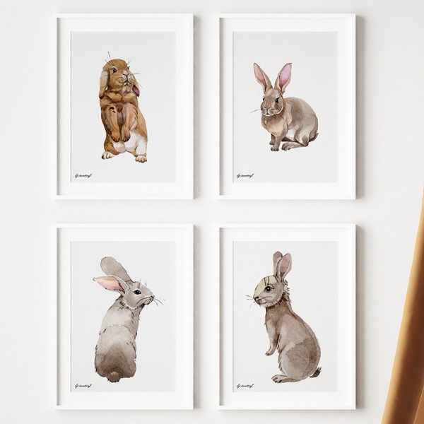 Serie de cuatro láminas de conejitos para habitaciones infantiles.