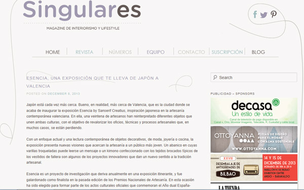 Extracto: (···) Japón está cada vez más cerca. Bueno, en realidad, más cerca de Valencia, que es la ciudad donde se acaba de inaugurar la exposición Esencia by Sanserif Creatius, inspiración japonesa en la artesanía contemporánea valenciana. En ella, una veintena de artesanos han reinterpretado diferentes objetos que unen ambas culturas, con el objetivo de revalorizar los oficios, técnicas y procesos artesanales que, en muchos casos, se están perdiendo (···) Más info en Singulares