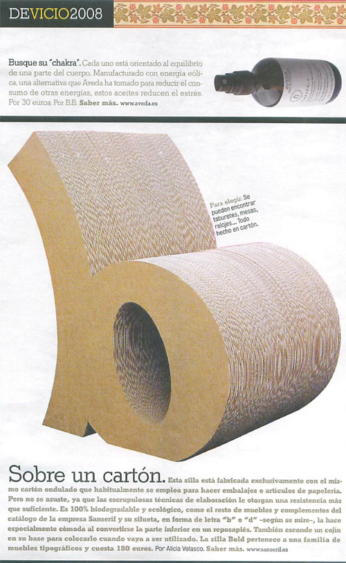 Texto de la noticia: Esta silla está fabricada exclusicamente con el mismo cartón ondulado que habitualmente se emplea para hacer embalajes o artículos de papelería. Pero no se asuste, ya que las escrupulosas técnicas de elaboración le otorgan una resistencia más que suficiente. Es 100% biodegradable y ecológico, como el reto de muebles y complementos dl catálogo de la empresa Sanserif y su silueta, en forma de letra “b” o “d” -según se mire-, la hace especialmente cómoda al convertirse la parte inferior en reposapiés. También esconde un cojín en su base para colocarlo cuando vaya a ser utilizado. La silla Bold pertenece a una familia de muebles tipográficos.