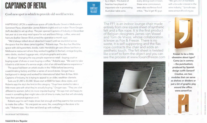 Un pequeño pasa para la Coma, un gran paso para Sanserif Creatius. Desde Sidney (Australia) nada menos nos llegan las últimas noticias del imparable avance de COMA, la última propuesta de Ana Yago y José Antonio Giménez para ordenar los interiores de la casa y la oficina. El prestigioso The Australian Financial Review Magazine ha incorporado una referencia de éste divisor de espacios en su sección The Company We Keep.