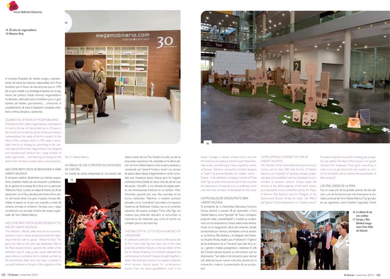 La revista El Sector ha incluido una amplia referencia de la exposición Three Little Pigs desarrollada por Sanserif Creatius para la última edición de Feria Hábitat Valencia. En un dossier especial en el que se han repasado todas las iniciativas y propuestas de este año, bajo el título de Más que Feria. Mucho más que Hábitat. Y todo en Valencia, la publicación ha calificado el proyecto liderado por Ana Yago y José Antonio Giménez como “una de las propuestas más aclamadas” del certamen. Un impulso más para configurar un futuro de cartón en el hogar y la oficina.