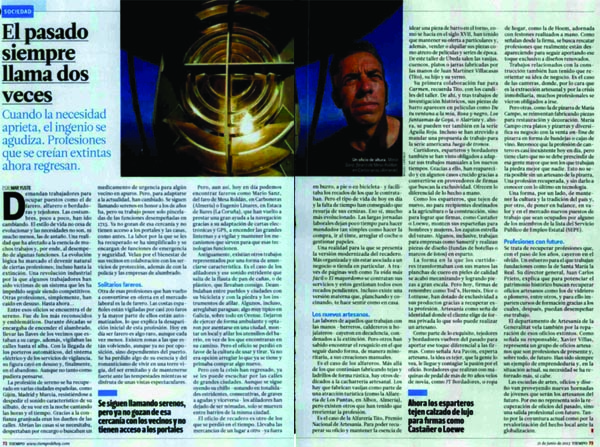Extracto: (···) Como los esparteros, que tejen de nuevo, no para recipientes destinados a la agricultura o la construcción, sino para lograr que firmas, como Castañer o Loewe, monten sus esparteñas para hombres y mujeres, los zapatos estrella del verano. Algunos, inclusive, trabajan para empresas como Sanserif y realizan piezas de diseño –fundas de botellas o marcos de fotos- en esparto. (···)