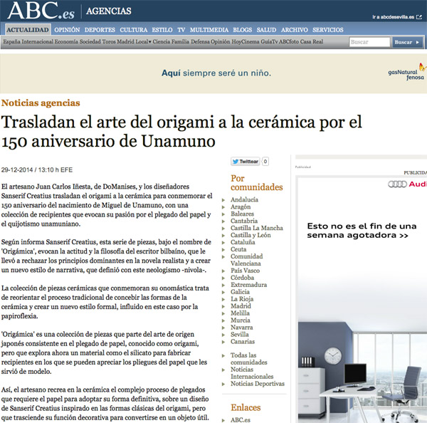 Extracto: (•••) La colección ‘Origámica’ desarrollada por Juan Carlos Iñesta y diseñada por Sanserif Creatius forma parte de los productos concebidos para el proyecto de investigación y desarrollo expositivo ‘Esencia, inspiración japonesa en la artesanía local’, con el objetivo de acercar los productos artesanos a las demandas de la sociedad contemporánea (•••) Más info en ABC