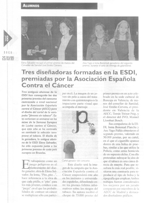 Esa era titular del Boletín DOCU de la Universidad Cardenal Herrera CEU en el que se recogía la noticia de los galardones nacionales de la Asociación Española Contra el Cáncer (AECC). Elena Salvador, Imma Bononad y Ana Yago eran las tres premiadas. Elena obtuvo el primer premio con la campaña “Pito, pito…”, mientras que Yago y Bononad quedaron en segundo lugar con su proyecto “Prueba archivada.”