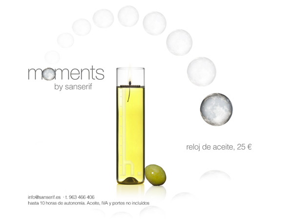 Moments imita el cuello y la picada de una botella de vino. Se ha desarrollado íntegramente en vidrio resistente a las altas temperaturas, y se alimenta de aceite de oliva a través de una mecha con base de cartón. Este reloj, que recupera la esencia de los antiguos candiles de aceite, tiene su origen en una expresión popular; Arder en un candil, que se utiliza para ponderar la fuerza del vino y, en términos generales, la agudeza o sagacidad de las personas o la eficacia de las cosas. De ahí que, las formas de Moments nazcan inspiradas en una botella de vino –cuello y picada- y en la eficiencia de un combustible tan natural como el aceite de oliva.
