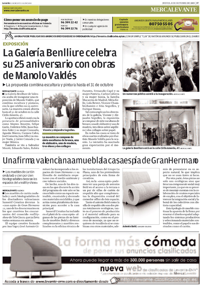 El suplemento empresarial de Levante-EMV recoge la elección de los muebles de cartón y biodegradables de Sanserif Creatius para la decoración de la “casa espía” de Gran Hermano 11. Mercalevante destaca la presencia del mobiliario valenciano en los decorados de este conocido reality-show y la decidida apuesta del equipo creativo liderado por Ana Yago por desarrollar muebles “diferentes” y que apuesten por “valores medioambientales y de crecimiento sostenible”, así como por la integración social de colectivos con diferente capacidad.