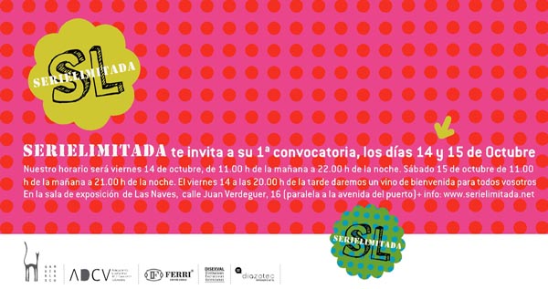 El próximo viernes, 14 de octubre, con un horario ininterrumpido de 11.00 h. de la mañana a 22.00 h. de la noche en espacio expositivo de Las Naves, (Juan Verdeguer 16), que se replicará el sábado 15 de octubre, se podrá visitar la exposición “Serie Limitada”, un proyecto que reúne a 17 diseñadoras y creativas de la Comunidad Valenciana y que permitirá ver –y adquirir a un precio especial- algunos de sus trabajos más personales. Atentos a la inauguración, prevista para el mismo viernes, a las 20 horas,