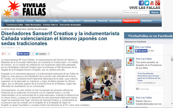 Extracto: (···) en este vestido se han recuperado las primeras referencias históricas de la confección de kimonos con un material rústico y se han implementado con la suntuosidad de la seda valenciana, imitando la influencia de la cultura china y coreana en el desarrollo de esta vestimenta tradicional nipona, según ha explicado Ana Yago, directora de Sanserif Creatius y coordinadora de un proyecto que ha contado con el respaldo de la Embajada de Japón en España, la Japan Foundation o el propio Centro de Artesanía de al CV, entre otras entidades (···) Más info en Vive Las Fallas