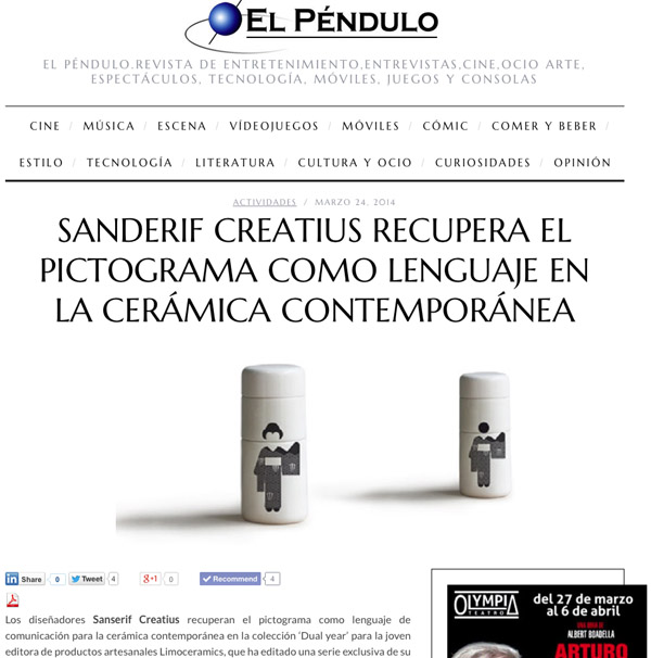 Extracto: (···) Los diseñadores Sanserif Creatius recuperan el pictograma como lenguaje de comunicación para la cerámica contemporánea en la colección ‘Dual year’ para la joven editora de productos artesanales Limoceramics, que ha editado una serie exclusiva de su pieza referencial ‘Trío’ con recreaciones de símbolos culturales nipones para conmemorar el Año Dual España-Japón (···) Más info en el El Péndulo
