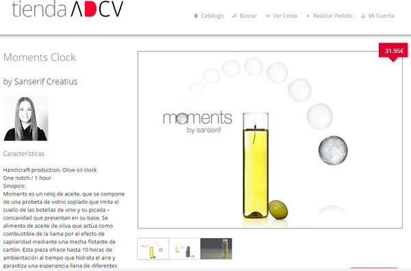 Moments es un reloj de aceite, que se compone de una probeta de vidrio soplado que imita el cuello de las botellas de vino y su picada –concavidad que presentan en su base-. Se alimenta de aceite de oliva que actúa como combustible de la llama por el efecto de capilaridad mediante una mecha flotante de cartón. Un objeto pensado para medir el tiempo en silencio.